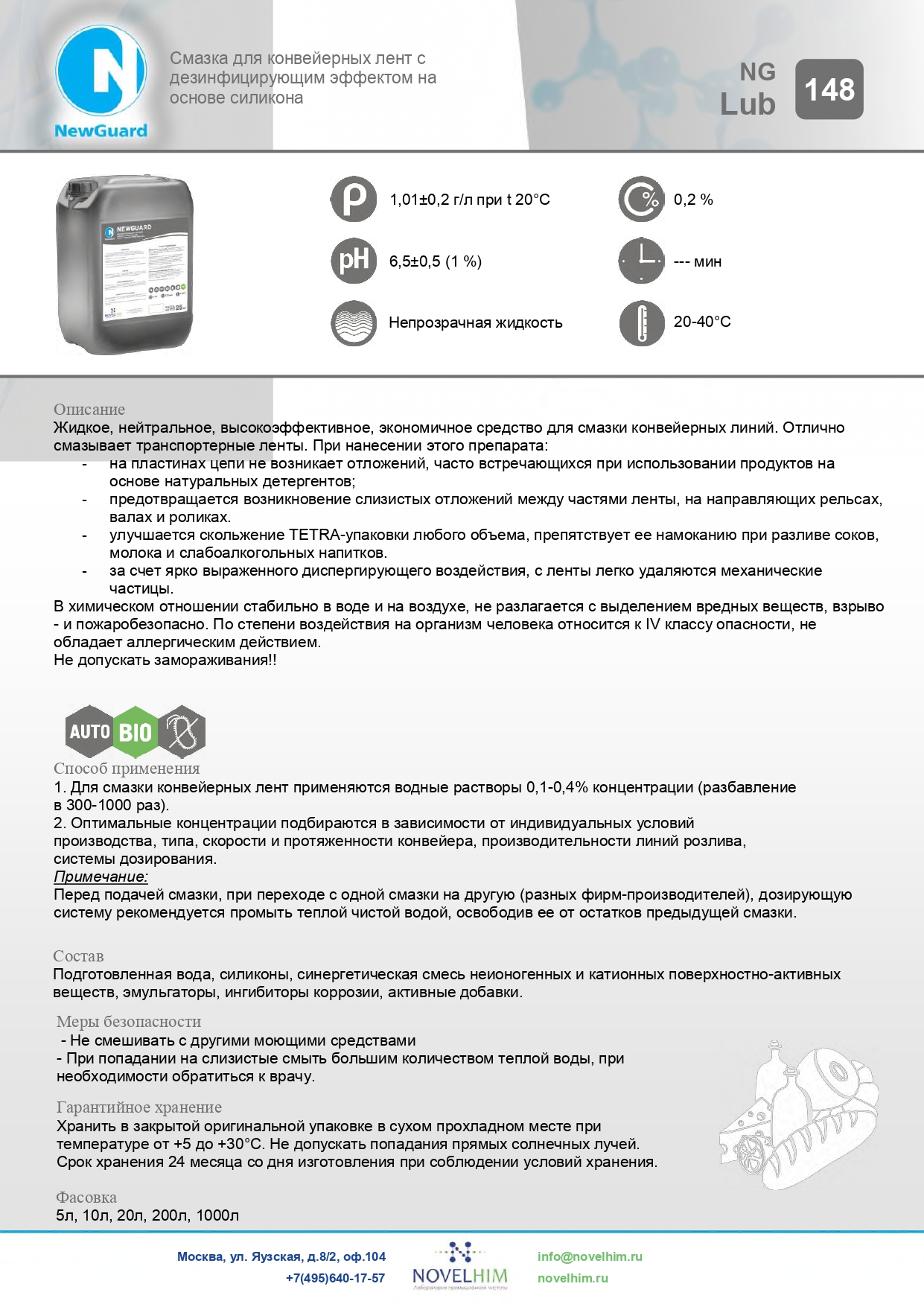 148 NG Lub Смазка для конвейерных лент с дезинфицирующим эффектом на основе силикона. Канистра 5л.