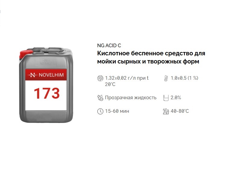 Концентрированное жидкое кислотное беспенное средство на основе ортофосфорной кислоты с содержанием комплекса органических кислот. Предназначено для мойки форм прессования сыра и творога, изготовленных из пластических материалов (ПВХ, полипропилен, полистирол), нержавеющей стали. Применяется как в моечных машинах в автоматическом режиме, так и методом замачивания.
