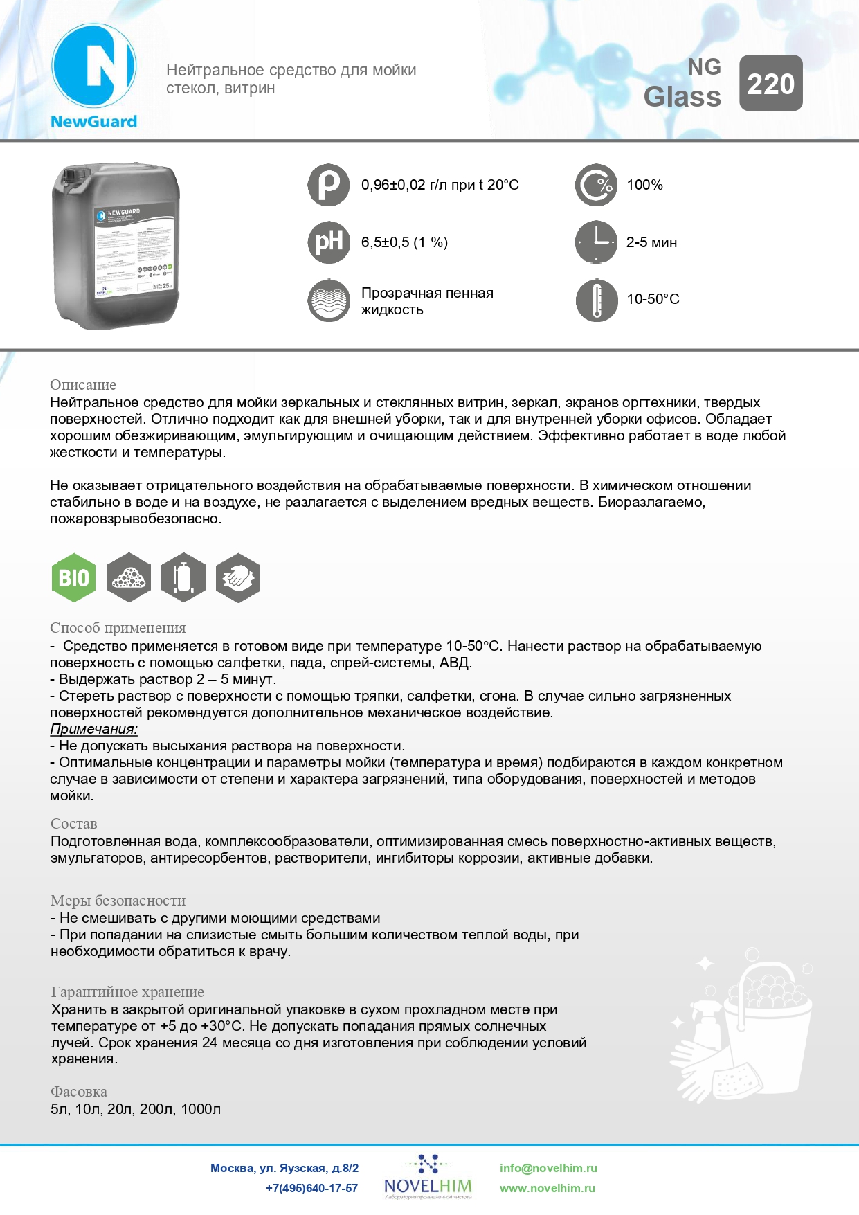 220 NG Glass Нейтральное средство для мойки стекол, витрин, готовое к применению. Канистра 5л.